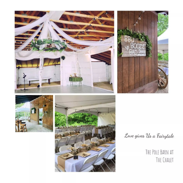 Chalet Lodge & Pole Barn. We host beautiful, rustic Hocking Hills destination weddings at The Chalet Lodge & Pole Barn Wedding Venue located in the Star of Hocking Hills. The Chalet Lodge is a 16-person A-frame lodge that sits adjacent to a magnificent, open pole barn great for hosting the perfect rustic wedding.